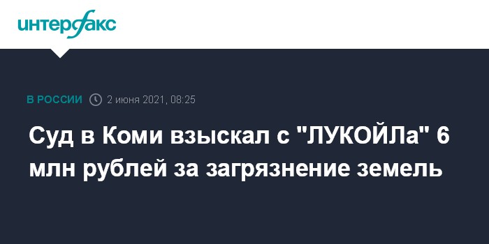 Москва. 2 июня. INTERFAX.RU - Арбитражный суд Коми по иску Росприроднадзора взыскал с ООО "ЛУКОЙЛ-Коми" почти 6 млн рублей ущерба, причиненного землям под Ухтой в результате загрязнения нефтесодержащей жидкостью. Об этом говорится в материалах суда.
