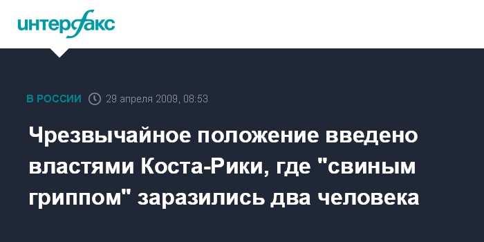 Москва. 29 апреля. INTERFAX.RU - Режим чрезвычайного положения введен властями Коста-Рики в связи с распространением "свиного гриппа", объявила министр здравоохранения Мариа Луиса Авила.