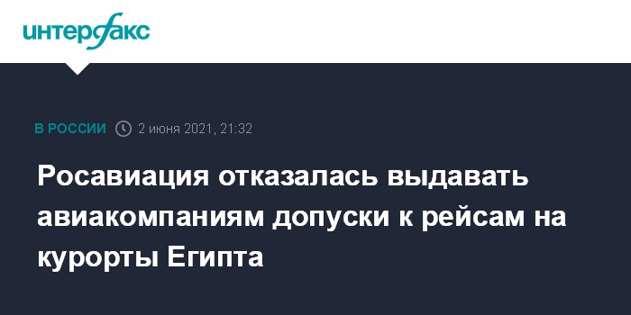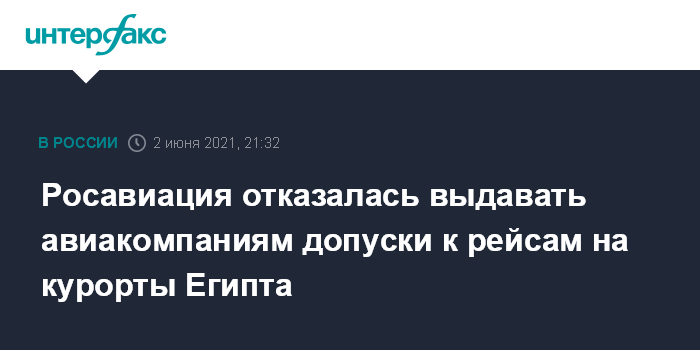 Москва. 2 июня. INTERFAX.RU - Росавиация отказалась выдавать авиакомпаниям допуски к регулярным рейсам в курортные города Египта Хургаду и Шарм-эль-Шейх, следует из приказа ведомства по итогам заседания межведомственной комиссии при Минтрансе.