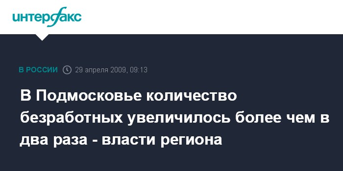 Москва. 29 апреля. INTERFAX.RU - В Подмосковье количество зарегистрированных безработных с начала этого года увеличилось более чем вдвое и составило около 55 тысяч человек, сообщил "Интерфаксу" председатель комитета по труду и занятости населения Подмосковья Юрий Рогозин