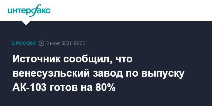 Москва. 3 июня. INTERFAX.RU - Россия продолжает строить в Венесуэле завод по лицензионному производству автоматов Калашникова АК-103 и боеприпасов, сообщил "Интерфаксу" источник, знакомый с ходом работ.
