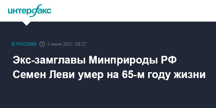 Москва. 3 июня. INTERFAX.RU - Бывший заместитель министра природных ресурсов и экологии РФ Семен Леви, работавший в ведомстве с 2008 по 2016 годы, скончался на 65-м году жизни, сообщается на сайте Заксобрания Пермского края в четверг.