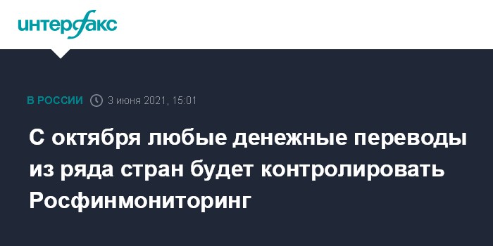 Москва. 3 июня. INTERFAX.RU - Росфинмониторинг по согласованию с Банком России составит список государств, денежные переводы из которых в адрес российских граждан и компаний с 1 октября 2021 года подпадут под обязательный контроль службы вне зависимости от суммы перевода.