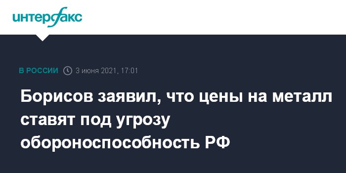 Москва. 3 июня. INTERFAX.RU - Высокие цены на металл могут негативно повлиять на выполнение государственного оборонного заказа, заявил вице-премьер Юрий Борисов. По его словам, правительство РФ готово обсуждать с металлургами компромиссные варианты решения проблемы с ростом цен на их продукцию.