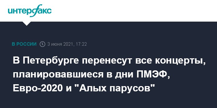 Москва. 3 июня. INTERFAX.RU - Комитет по культуре Петербурга принял решение о переносе концертов, которые должны были пройти во время ПМЭФ, Евро-2020 и праздника "Алые паруса".