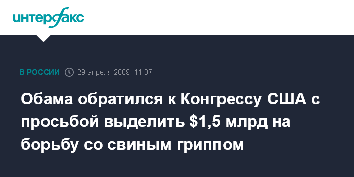 Москва. 29 апреля. INTERFAX.RU – Белый дом обратился к Конгрессу США с просьбой о выделении дополнительно $1,5 млрд на борьбу с распространением вируса свиного гриппа, сообщает в среду телекомпания Си-Эн-Эн.