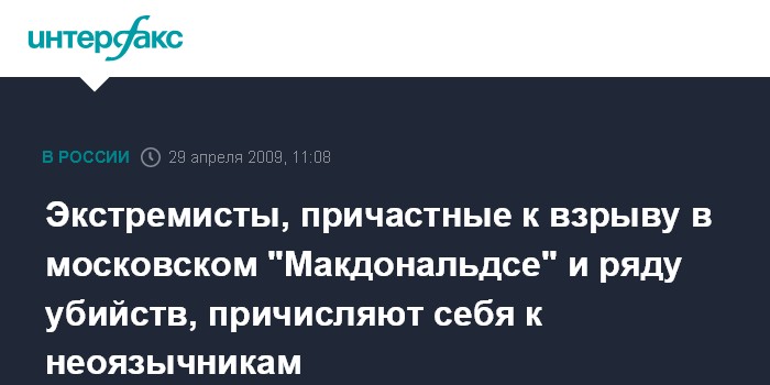 Москва. 29 апреля. INTERFAX.RU – Участники молодежной экстремистской группировки, причастные к взрыву в ресторане Макдональдс на востоке Москвы и к ряду убийств выходцев с Кавказа и из Средней Азии, были последователями неоязычества.