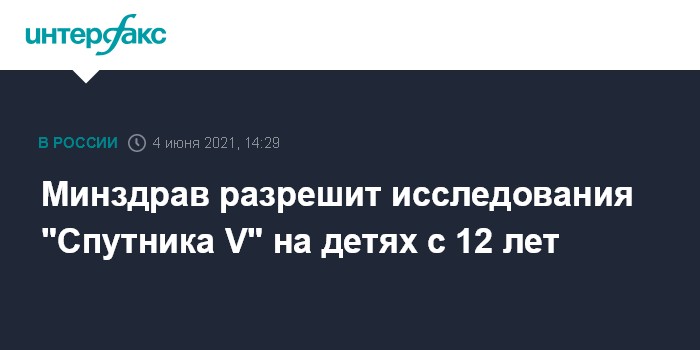 Москва. 4 июня. INTERFAX.RU - Минздрав готовится в ближайшее время разрешить исследование безопасности и эффективности применения вакцины "Спутник V" на детях с 12 лет, сообщил министр здравоохранения РФ Михаил Мурашко.