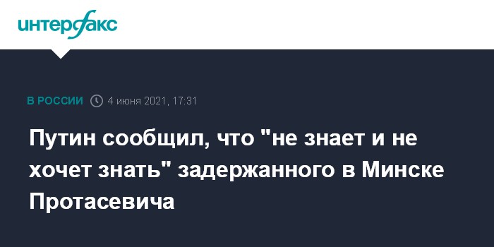 Москва. 4 июня. INTERFAX.RU - Президент РФ Владимир Путин заявил, что не знает задержанного в Минске сооснователя телеграм-канала NEXTA (признан в Беларуси экстремистским) Романа Протасевича.