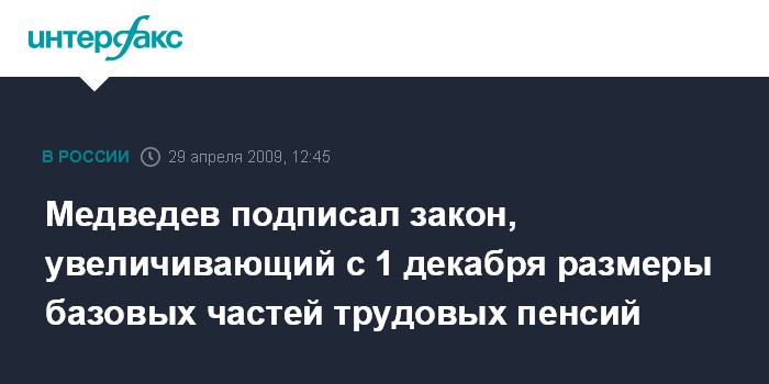 Федеральный закон предусматривает увеличение с 1 декабря 2009 г. размеров базовых частей трудовых пенсий всех видов - по старости, по инвалидности, по случаю потери кормильца.