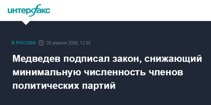 Москва. 29 апреля. INTERFAX.RU - Президент России Дмитрий Медведев подписал федеральный закон о политических партиях в связи с поэтапным снижением минимальной численности членов партий, сообщила в среду пресс-служба главы государства.