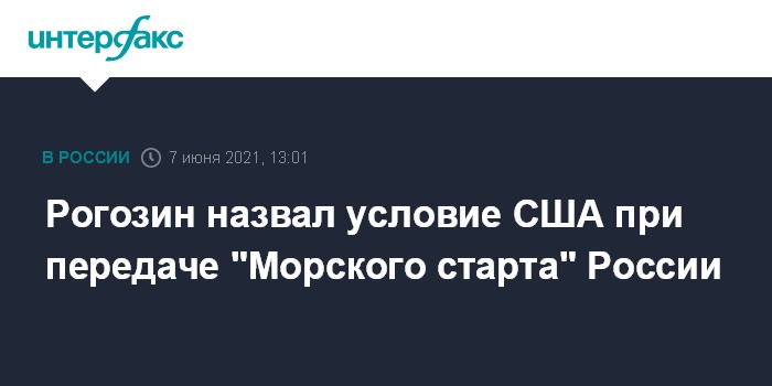 Москва. 7 июня. INTERFAX.RU - Правительство США при передаче "Морского старта" российской авиакомпании S7 потребовало, чтобы плавучий космодром не использовался для конкуренции со SpaceX, сообщил в Госдуме гендиректор "Роскосмоса" Дмитрий Рогозин.