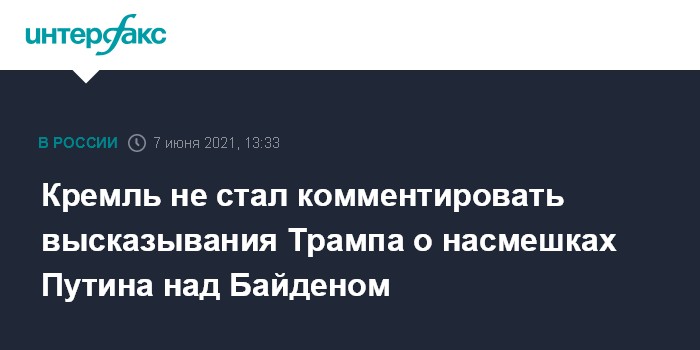 Москва. 7 июня. INTERFAX.RU - Пресс-секретаря главы государства Дмитрия Пескова попросили прокомментировать недавние высказывания экс-президента США Дональда Трампа, который заявил, что Путин "открыто насмехается над Байденом".