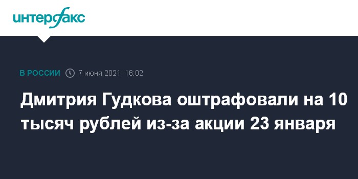 Москва. 7 июня. INTERFAX.RU - Савеловский суд Москвы назначил административный штраф в 10 тысяч рублей оппозиционеру Дмитрию Гудкову за нарушение правил проведения публичного мероприятия из-за акции в поддержку Алексея Навального 23 января в Москве. Об этом "Интерфаксу" сообщил в понедельник адвокат Гудкова Александр Альдаев, сотрудничающий с проектом "Апология протеста".