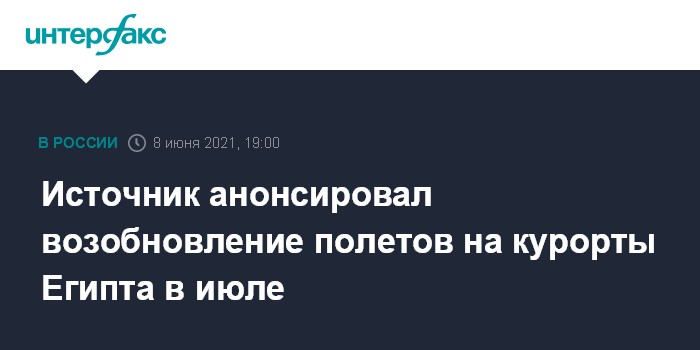 "Предполагается возобновление в начале июля прямого регулярного, а позднее чартерного авиасообщения с аэропортами Хургады и Шарм-эль-Шейха", - сказал собеседник агентства.
