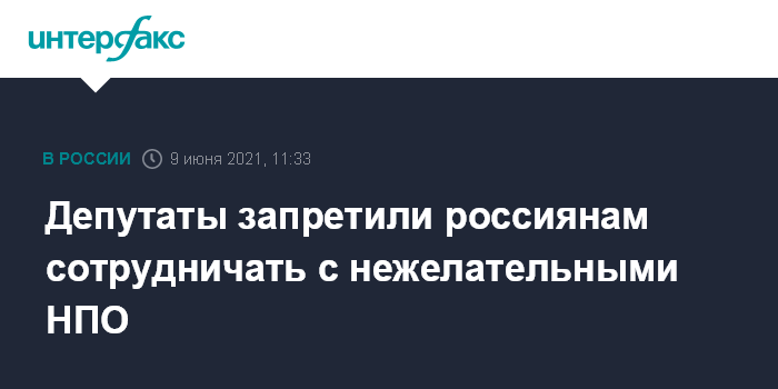 Москва. 9 июня. INTERFAX.RU - Госдума приняла в третьем чтении закон о запрете российским гражданам и юридическим лицам в любой стране мира принимать участие в работе иностранных неправительственных организаций (НПО), признанных в России нежелательными.