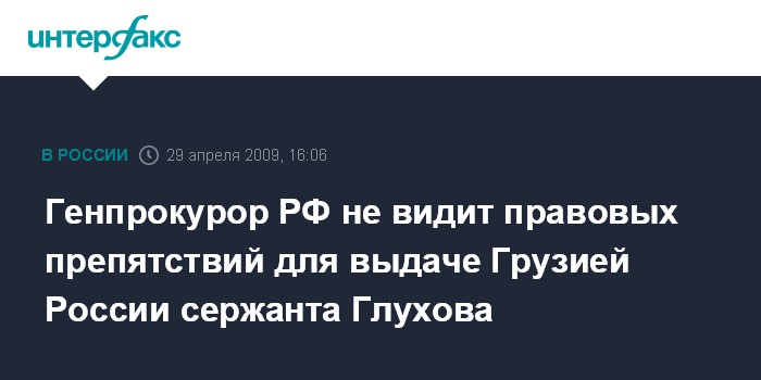 Москва. 29 апреля. INTERFAX.RU - Генеральный прокурор России Юрий Чайка не видит препятствий для выдачи грузинской стороной российского военнослужащего Александра Глухова, дезертировавшего в Южной Осетии.