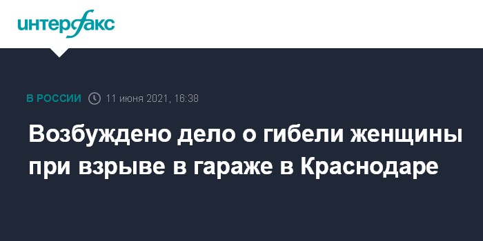 Москва. 11 июня. INTERFAX.RU - В Краснодаре возбуждено уголовное дело в связи с гибелью женщины в результате взрыва в гаражном боксе, сообщили в управлении СК по Кубани. Дело расследуется по ч.1 ст. 109 УК (причинение смерти по неосторожности).