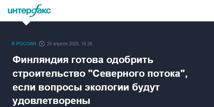 Москва. 29 апреля. INTERFAX.RU - Финляндия готова одобрить строительство газопровода "Северный поток", если вопросы экологической безопасности "будут удовлетворены", заявила в эксклюзивном интервью радиостанции "Эхо Москвы" президент Финляндии Тарья Халонен. "У нас есть юридическая процедура, по которой мы должны одобрить формально такое строительство. Я не думаю, что это займет много времени", - сказала она.