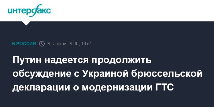 Москва. 29 апреля. INTERFAX.RU - Премьер-министр РФ Владимир Путин надеется на продолжение дискуссии с Украиной относительно заключенной в Брюсселе декларации о модернизации украинской ГТС.