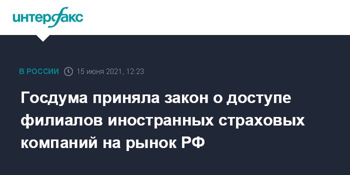 Москва. 15 июня. INTERFAX.RU - Госдума приняла в окончательном, третьем чтении закон, который с 22 августа 2021 года разрешает филиалам иностранных страховых компаний доступ на рынок РФ.