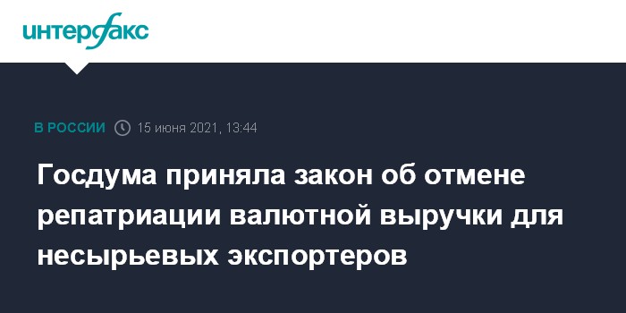 Москва. 15 июня. INTERFAX.RU - Госдума приняла в окончательном, третьем, чтении закон, который с 1 июля текущего года отменяет для несырьевого неэнергетического экспорта требование об обязательной репатриации на счета участников ВЭД в уполномоченных банках иностранной валюты. Речь идет о контрактах и выручке за переданные товары, оказанные работы или услуги, переданную информацию или результаты интеллектуальной деятельности.