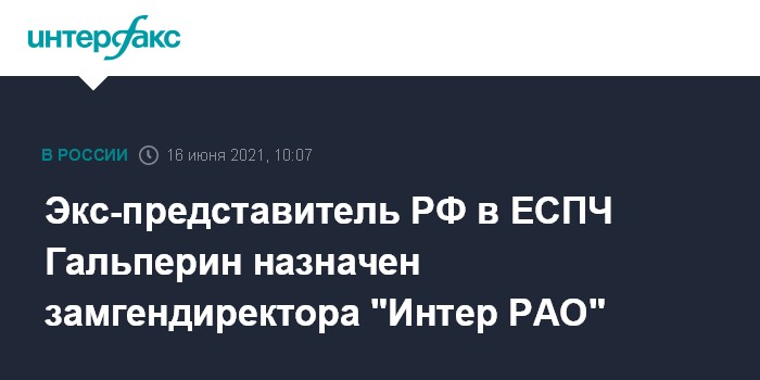 Москва. 16 июня. INTERFAX.RU - Михаил Гальперин, ранее занимавший пост уполномоченного РФ при Европейском суде по правам человека (ЕСПЧ) - замминистра юстиции РФ, назначен замгендиректора - руководителем блока правовой работы ПАО "Интер РАО", сообщила энергокомпания.