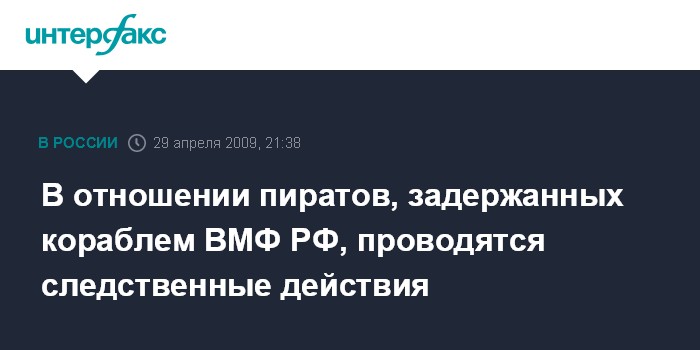 Москва. 29 апреля. INTERFAX.RU - На борту российского корабля "Адмирал Пантелеев" сейчас проводятся следственные действия с пиратами, задержанными накануне в восточной части Аденского залива, сообщает в среду управление пресс-службы и информации Минобороны РФ.