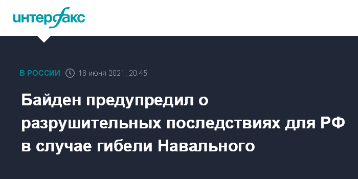 Москва. 16 июня. INTERFAX.RU - Президент США Джо Байден сообщил, что в ходе встречи с российским коллегой Владимиром Путиным заявил ему о разрушительных последствиях для России в случае гибели оппозиционера Алексея Навального, находящегося в заключении.