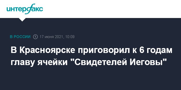 Москва. 17 июня. INTERFAX.RU - Железнодорожный районный суд Красноярска вынес приговор 48-летнему организатору местной ячейки "Свидетелей Иеговы" (организация запрещена в РФ), сообщает пресс-служба краевой прокуратуры.
