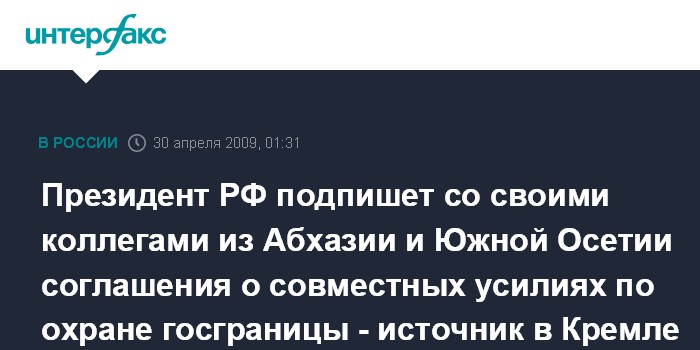Москва. 29 апреля. ИНТЕРФАКС - Церемония подписания на высшем уровне двусторонних соглашений РФ о совместных усилиях в охране госграницы с Республикой Абхазия и Республикой Южная Осетия состоится в четверг в Москве, сообщил "Интерфаксу" источник в Кремле.