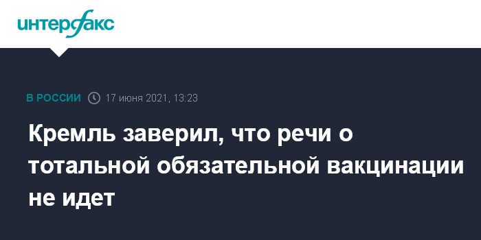 Москва. 17 июня. INTERFAX.RU - В настоящее время не идет речи о тотальной обязательной вакцинации во всей стране, заявил пресс-секретарь президента РФ Дмитрий Песков.