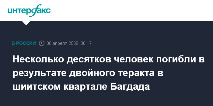 Москва. 30 апреля. INTERFAX.RU - Не менее 41 человека погибли в минувшую среду в результате подрыва двух автомашин в Багдаде, сообщил иранский англоязычный телеканал "Пресс ТВ" со ссылкой на представителей полиции в иракской столице.