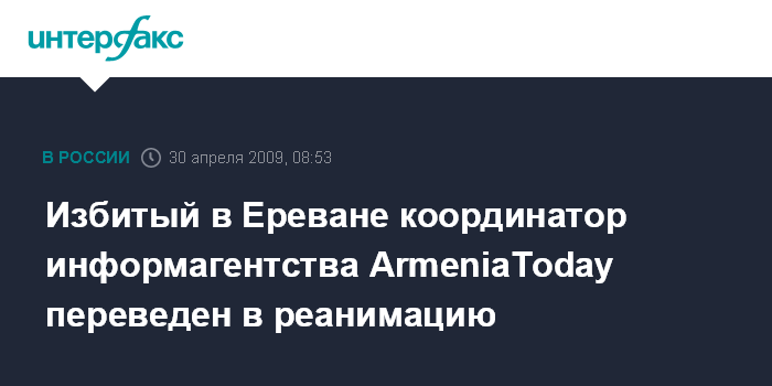 Москва. 30 апреля. INTERFAX.RU - Избитый в Ереване координатор информационного агентства ArmeiaToday Аргишти Кивирян находится в реанимационном отделении медцентра "Эребуни".