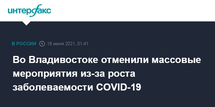 Москва. 18 июня. INTERFAX.RU - Власти Владивостока из-за роста заболеваемости коронавирусом отменили массовые мероприятия в городе, сообщил пятницу исполняющий обязанности главы Владивостока Константин Шестаков.