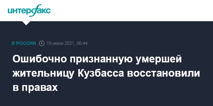 По требованию прокуратуры суд обязал ЗАГС аннулировать запись о смерти кемеровчанки. Также к ответственности были привлечены сотрудники полиции, которые не в полном объеме провели мероприятия по установлению личность умершей.