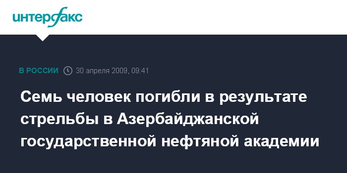Москва. 30 апреля. INTERFAX.RU - Семь человек погибло в результате стрельбы, учиненной неизвестным утром в четверг в Азербайджанской государственной нефтяной академии, сообщает корреспондент "Интерфакс-Азербайджан" с места событий.