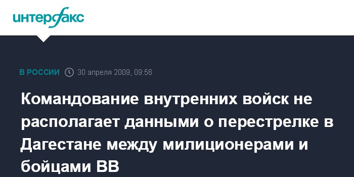 Москва. 30 апреля. INTERFAX.RU - В командовании внутренних войск МВД РФ не располагают информацией о перестрелке в среду в Дагестане между военнослужащими Внутренних войск и сотрудниками дагестанской милиции.