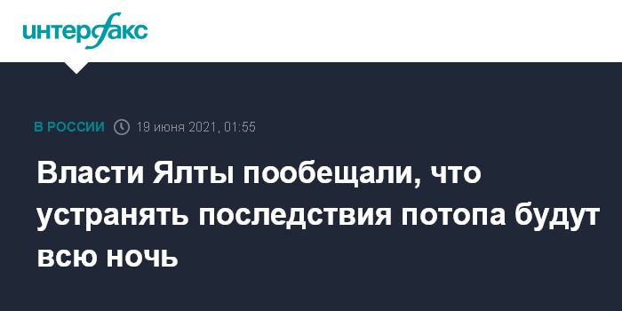Москва. 19 июня. INTERFAX.RU - Работы по ликвидации последствий сильнейшего ливня в Ялте будут продолжаться всю ночь, сообщила глава администрации города Янина Павленко в фейсбуке.