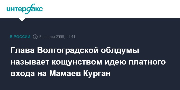 "Я считаю кощунством вообще поднимать вопрос о том, а не сделать ли вход на Мамаев Курган платным", - сказал В.Лихачев в интервью агентству "Интерфакс-Юг".
