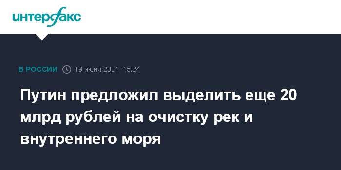 Москва. 19 июня. INTERFAX.RU - Президент РФ Владимир Путин предложил направить 20 млрд рублей на очистку рек и внутреннего моря России.