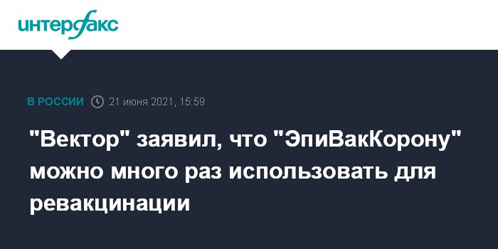 Москва. 21 июня. INTERFAX.RU - Разработанная научным центром "Вектор" Роспотребнадзора вакцина "ЭпиВакКорона" может использоваться для ревакцинации неограниченное число раз, сообщили в "Векторе".