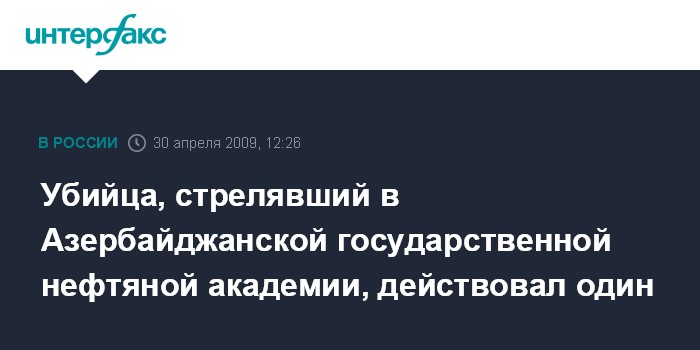 Москва. 30 апреля. INTERFAX.RU - Все убийства в Азербайджанской государственной нефтяной академии совершил один человек, сообщает телеканал ANS. Согласно последним данным, погибло 13 человек.