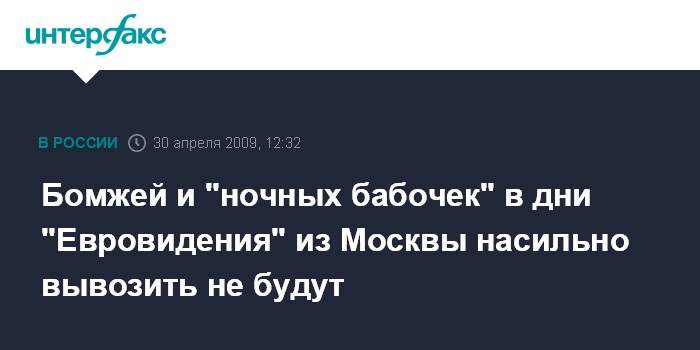 Москва. 30 апреля. INTERFAX.RU - Власти Москвы и столичная милиция обещают, что безопасность в городе во время проведения конкурса "Евровидение-2009" будет обеспечена на высшем уровне, при этом насильно вывозить за пределы города лиц без определенного места жительства и женщин легкого поведения не будут.