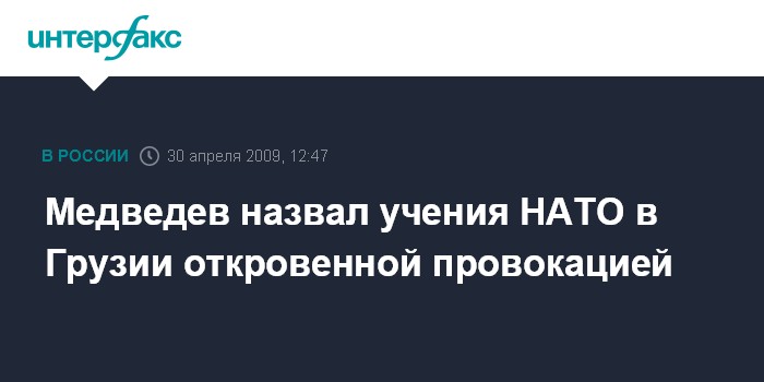 Москва. 30 апреля. INTERFAX.RU - Президент РФ Дмитрий Медведев назвал "отковенной провокацией" планы НАТО по проведению военных учений на территории Грузии. Учения в рамках программы НАТО "Партнерство ради мира" запланированы на территории Грузии в период с 6 мая по 1 июня.