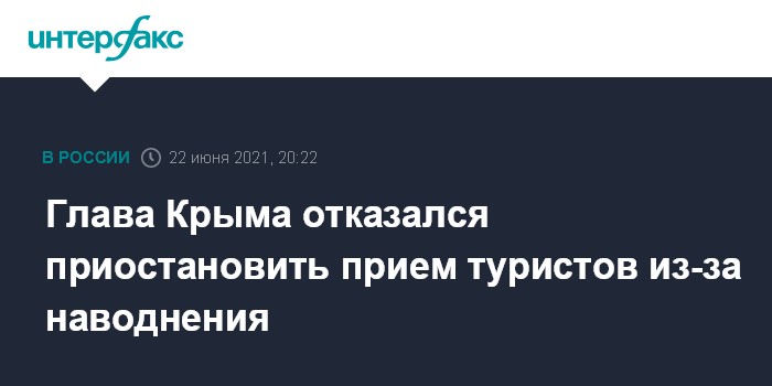 Москва. 22 июня. INTERFAX.RU - Роспотребнадзор предложил властям Крыма приостановить прием туристов в санаторно-курортных учреждениях из-за проблем и угроз на фоне наводнения, но глава республики Сергей Аксенов решил пока этого не делать.