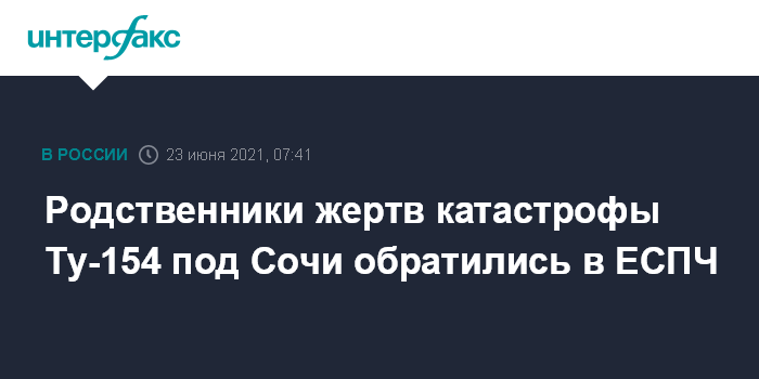 Москва. 23 июня. INTERFAX.RU - В Европейский суд по правам человека направлена жалоба, в которой заявители просят признать нарушенным их право на справедливое судебное разбирательство, а также настаивают на необоснованности прекращения уголовного дела по факту крушения в Сочи самолета Минобороны РФ Ту-154 в 2016 году, сообщил "Интерфаксу" адвокат истцов Игорь Трунов.