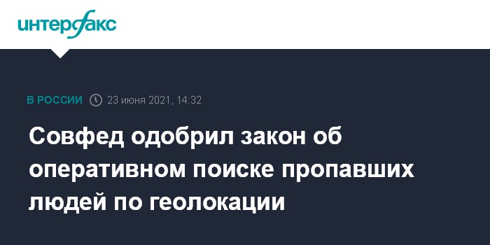 Москва. 23 июня. INTERFAX.RU - Совет Федерации на заседании в среду одобрил закон, позволяющий начинать поиск пропавших без вести по геолокационным данным мобильных устройств сразу после получения заявления о пропаже.
