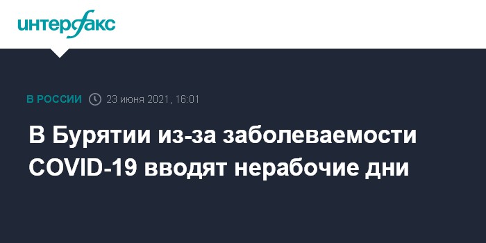 Москва. 23 июня. INTERFAX.RU - Власти Бурятии из-за осложнения ситуации с распространением коронавирусной инфекции и ростом числа заболевшим введут режим нерабочих дней с 27 июня по 11 июля, сообщили журналистам в пресс-службе правительства республики.