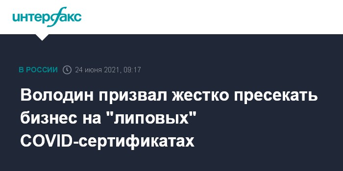 Москва. 24 июня. INTERFAX.RU - Спикер Госдумы Вячеслав Володин призвал жестко наказывать мошенников, продающих поддельные справки о вакцинации, и не пользоваться их услугами.